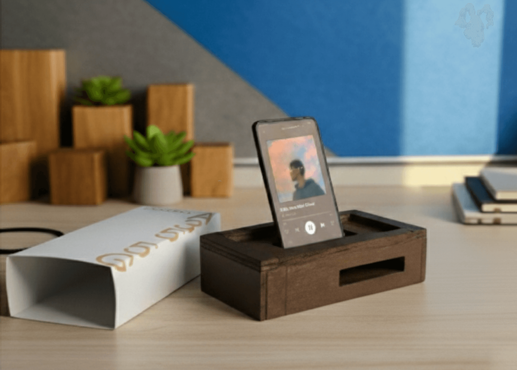 Sustainable, reusable phone box that can be used as a passive speaker and phone stand, made out of MDF