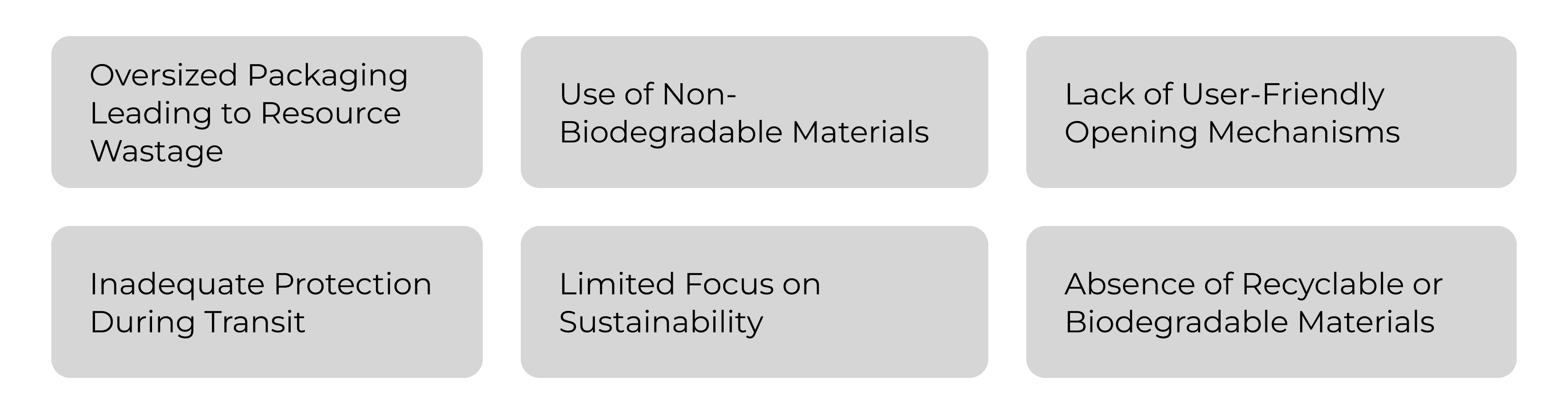 The existing phone boxes use cardboard, paperboard, or corrugated fiberboard and have a plastic covering it, making the box not sustainable. These boxes, after the phone is out of it, sit in drawers collecting dust, without any use. The existing packaging causes us to focus on: